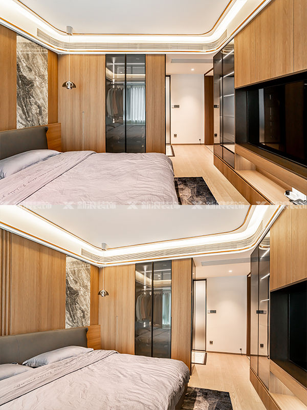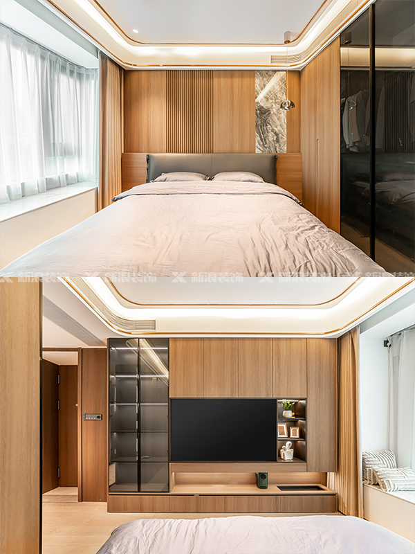 全屋定制一體化設(shè)計,床頭木飾面硬包搭配吊頂香檳金線條,高級感瞬間拉滿!