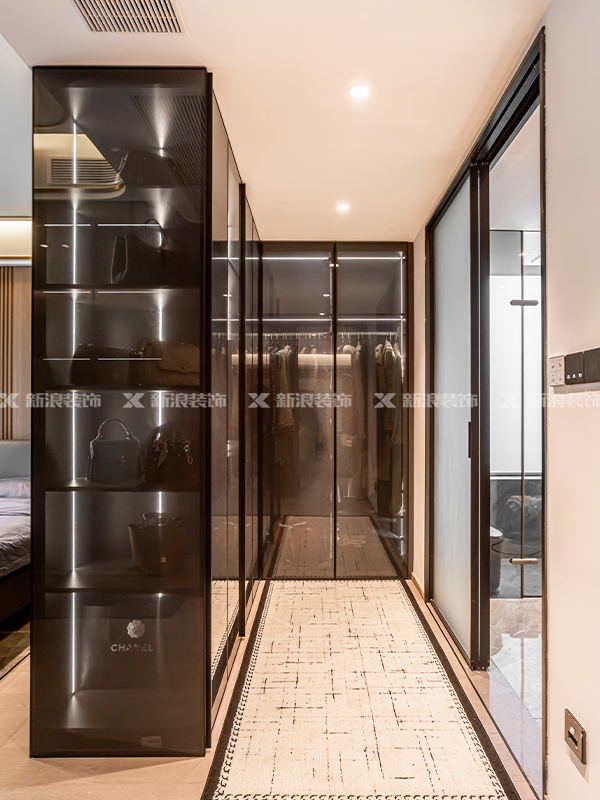 衣帽間柜門采用夾紗工藝玻璃和紗線交織,衣物在光影中若隱若現(xiàn),飄逸又修長,簡直是時尚達(dá)人的最愛!