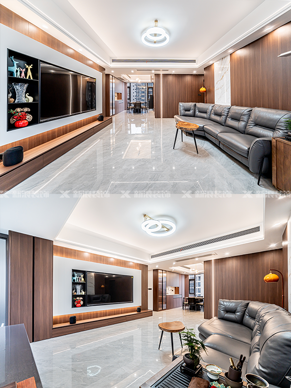 電視墻整面大理石搭配溫潤(rùn)木飾面