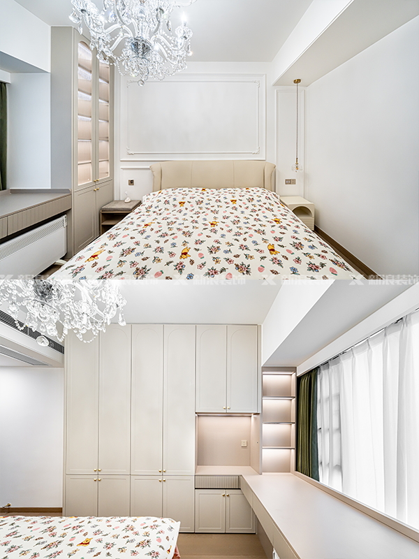 主臥利用床尾加飄窗空間,整體設(shè)計(jì)床尾衣柜+飄窗書桌,增加收納空間。