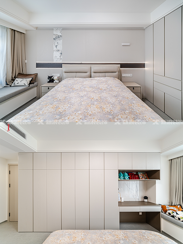 電視墻整面昆侖巖板(仿大理石紋),粗獷紋理搭配象牙灰護墻板,輕奢氣場拉滿